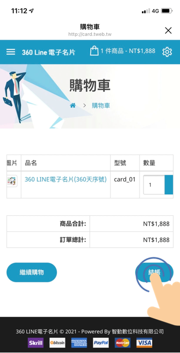 目錄 搜索 展開 360LINE電子名片一、購買流程1.購買序號2.至購物車結帳3.填寫帳單地址 (非必填)4.確認付款方式5.確認訂單6.訂單提交7.匯款完成,啟用序號二、開通、啟用序號流程1.搜尋ID : @360line 加入2.點選註冊/登入3.會員帳號設置三、啟用序號方法(一)方法(二)四、360LINE官方帳號使用說明1.查找名片2.我的名片3.分享我的名片4.編輯名片5.推薦好友6.會員資料 暫無相關搜索結果! 閱讀次數:755 本文檔使用 CLEARONE 發布 2.至購物車結帳 2.至購物車結帳作者:Anne 创建时间:2022-06-20 10:59最后编辑:Anne 更新时间:2022-06-21 08:54