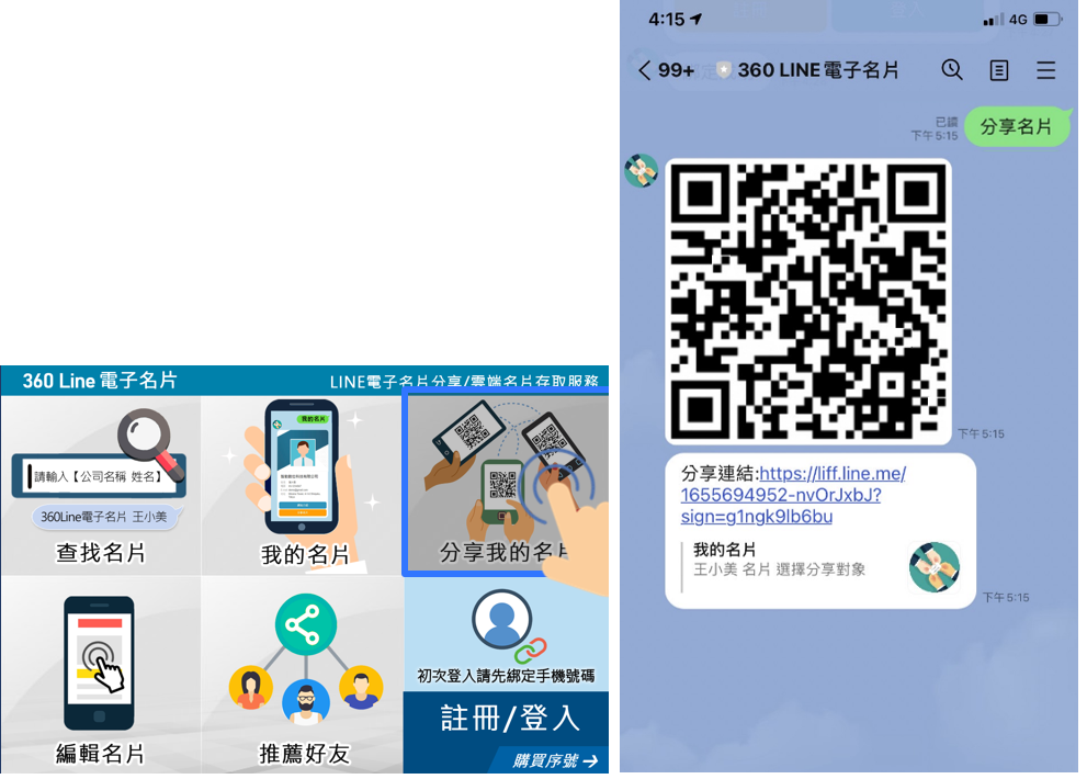 目錄 搜索 展開 360LINE電子名片一、購買流程1.購買序號2.至購物車結帳3.填寫帳單地址 (非必填)4.確認付款方式5.確認訂單6.訂單提交7.匯款完成,啟用序號二、開通、啟用序號流程1.搜尋ID : @360line 加入2.點選註冊/登入3.會員帳號設置三、啟用序號方法(一)方法(二)四、360LINE官方帳號使用說明1.查找名片2.我的名片3.分享我的名片4.編輯名片5.推薦好友6.會員資料 暫無相關搜索結果! 閱讀次數:737 本文檔使用 CLEARONE 發布 3.分享我的名片 3.分享我的名片顯示QR CODE與分享連結,可立即與LINE好友分享名片。作者:Anne 创建时间:2022-06-20 14:32最后编辑:Anne 更新时间:2022-06-21 08:41